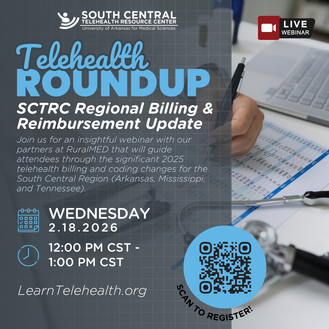 Join us for an insightful webinar with our partners at RuralMED that will guide attendees through the significant 2025 telehealth billing and coding changes for the South Central Region (Arkansas, Mississippi, and Tennessee).